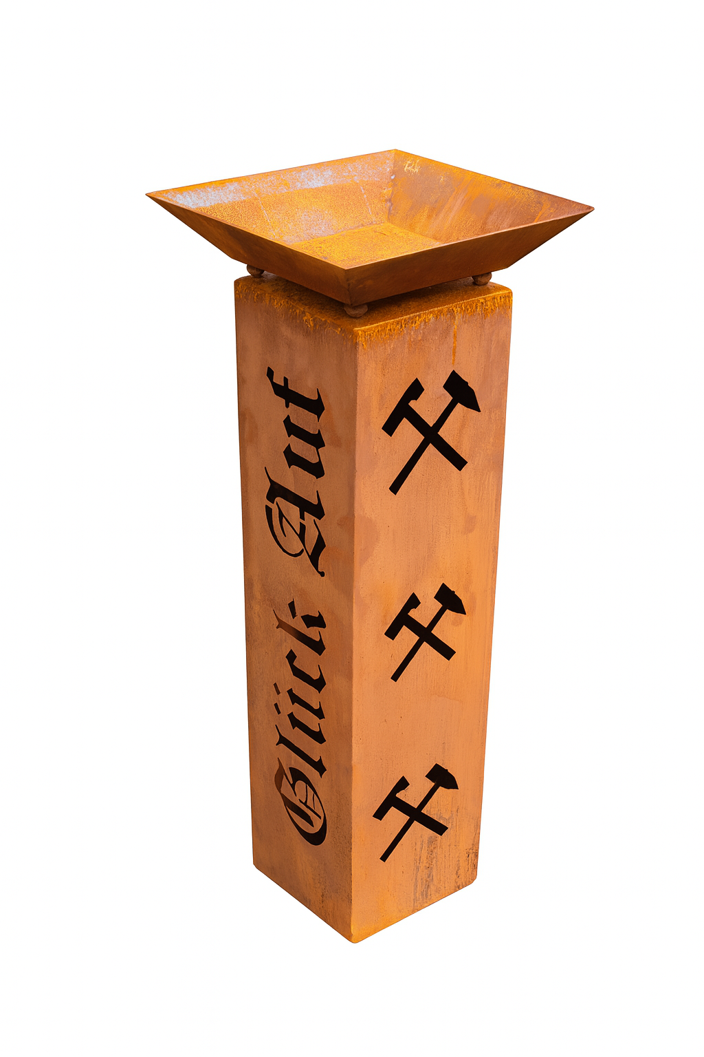 Gartensäule „GLÜCK AUF“ – Echte Revierkultur für Haus & Garten – Glück Auf! Beschreibung Diese beeindruckende Rostsäule im Format 30 × 30 × 100 cm ist eine Hommage an die Tradition des Bergbaus und ein dekoratives Statement echter Heimatverbundenheit. Auf zwei Seiten der Säule befinden sich jeweils drei filigran ausgelaserte Hammer-und-Schlägel-Symbole, begleitet vom markanten Schriftzug „Glück Auf“ – dem traditionellen Gruß der Bergleute. Hergestellt aus massivem Stahl, entwickelt die Oberfläche im Laufe der Zeit eine natürliche, lebendige Edelrost-Patina, die jede Säule zu einem echten Unikat macht. Ob im Garten, Eingangsbereich, auf der Terrasse oder im Innenraum – diese Stele strahlt Rustikalität, Stärke und kulturelle Bedeutung aus. Ideal als Geschenk für Ruhrpott-Fans, Bergbau-Begeisterte oder alle, die das regionale Erbe des Reviers schätzen. Produktdaten Material: robustes Stahlblech (gerostet)Säule (Maße): Höhe 100 cm; Länge × Breite 30 × 30 cm Hinweis: Auswahl der Schalen erfolgt – sofern verfügbar – über die Varianten im Produkt. Verarbeitung & Kombination Stabile, verschweißte Ausführung Offene Unterseite zur unkomplizierten Unterleuchtung Perfekt kombinierbar mit Edelrost-Schalen, Deko-Elementen und Bepflanzung Highlights Edle Rostoptik – natürlich, warm & modern zugleich eine Seite mit Schriftzug „GLÜCK AUF“ und 2x Hammer &Schlägelauf zwei Seiten jeweils 3x Hammer & Schlägel Verschweißt für hohe Stabilität Offene Unterseite – ideal zur Beleuchtung mit Lampe oder LED Kombinierbar mit verschiedenen Edelrost-Schalen Jede Säule ein Unikat durch den natürlichen Rostprozess Wissenswertes Fertigung aus hochwertigem Stahlblech mit edler Rostpatina – ein natürlicher Prozess, der jedes Stück einzigartig macht Made in Germany – eigene Herstellung; auf Wunsch individuelle Anfertigungen möglich (gerne Angebot anfragen) Farbveränderung im Außenbereich ist natürlich: von rötlich-orange bis warmes Braun Rost kann abfärben – bitte empfindliche Untergründe (innen & außen) schützen Trotz sorgfältiger Verarbeitung können bei Metallteilen scharfe Kanten vorhanden sein Lieferumfang 1 × Gartensäule Schalen optional je nach gewählter Variante