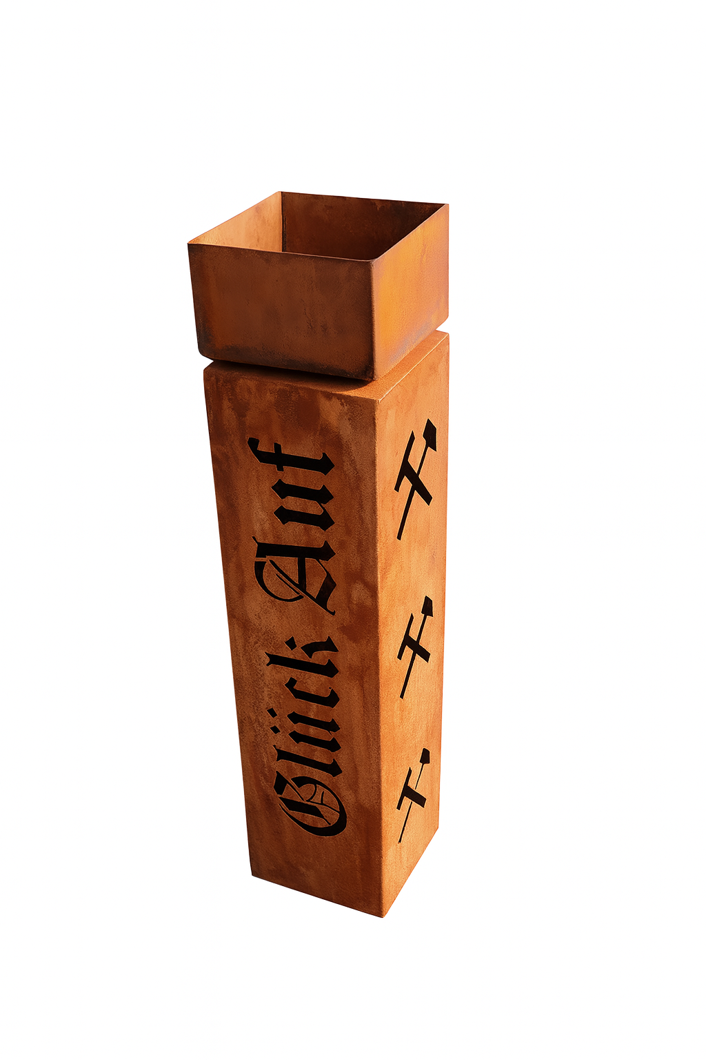 Gartensäule „GLÜCK AUF“ – Echte Revierkultur für Haus & Garten – Glück Auf! Beschreibung Diese beeindruckende Rostsäule im Format 30 × 30 × 100 cm ist eine Hommage an die Tradition des Bergbaus und ein dekoratives Statement echter Heimatverbundenheit. Auf zwei Seiten der Säule befinden sich jeweils drei filigran ausgelaserte Hammer-und-Schlägel-Symbole, begleitet vom markanten Schriftzug „Glück Auf“ – dem traditionellen Gruß der Bergleute. Hergestellt aus massivem Stahl, entwickelt die Oberfläche im Laufe der Zeit eine natürliche, lebendige Edelrost-Patina, die jede Säule zu einem echten Unikat macht. Ob im Garten, Eingangsbereich, auf der Terrasse oder im Innenraum – diese Stele strahlt Rustikalität, Stärke und kulturelle Bedeutung aus. Ideal als Geschenk für Ruhrpott-Fans, Bergbau-Begeisterte oder alle, die das regionale Erbe des Reviers schätzen. Produktdaten Material: robustes Stahlblech (gerostet)Säule (Maße): Höhe 100 cm; Länge × Breite 30 × 30 cm Hinweis: Auswahl der Schalen erfolgt – sofern verfügbar – über die Varianten im Produkt. Verarbeitung & Kombination Stabile, verschweißte Ausführung Offene Unterseite zur unkomplizierten Unterleuchtung Perfekt kombinierbar mit Edelrost-Schalen, Deko-Elementen und Bepflanzung Highlights Edle Rostoptik – natürlich, warm & modern zugleich eine Seite mit Schriftzug „GLÜCK AUF“ und 2x Hammer &Schlägelauf zwei Seiten jeweils 3x Hammer & Schlägel Verschweißt für hohe Stabilität Offene Unterseite – ideal zur Beleuchtung mit Lampe oder LED Kombinierbar mit verschiedenen Edelrost-Schalen Jede Säule ein Unikat durch den natürlichen Rostprozess Wissenswertes Fertigung aus hochwertigem Stahlblech mit edler Rostpatina – ein natürlicher Prozess, der jedes Stück einzigartig macht Made in Germany – eigene Herstellung; auf Wunsch individuelle Anfertigungen möglich (gerne Angebot anfragen) Farbveränderung im Außenbereich ist natürlich: von rötlich-orange bis warmes Braun Rost kann abfärben – bitte empfindliche Untergründe (innen & außen) schützen Trotz sorgfältiger Verarbeitung können bei Metallteilen scharfe Kanten vorhanden sein Lieferumfang 1 × Gartensäule Schalen optional je nach gewählter Variante