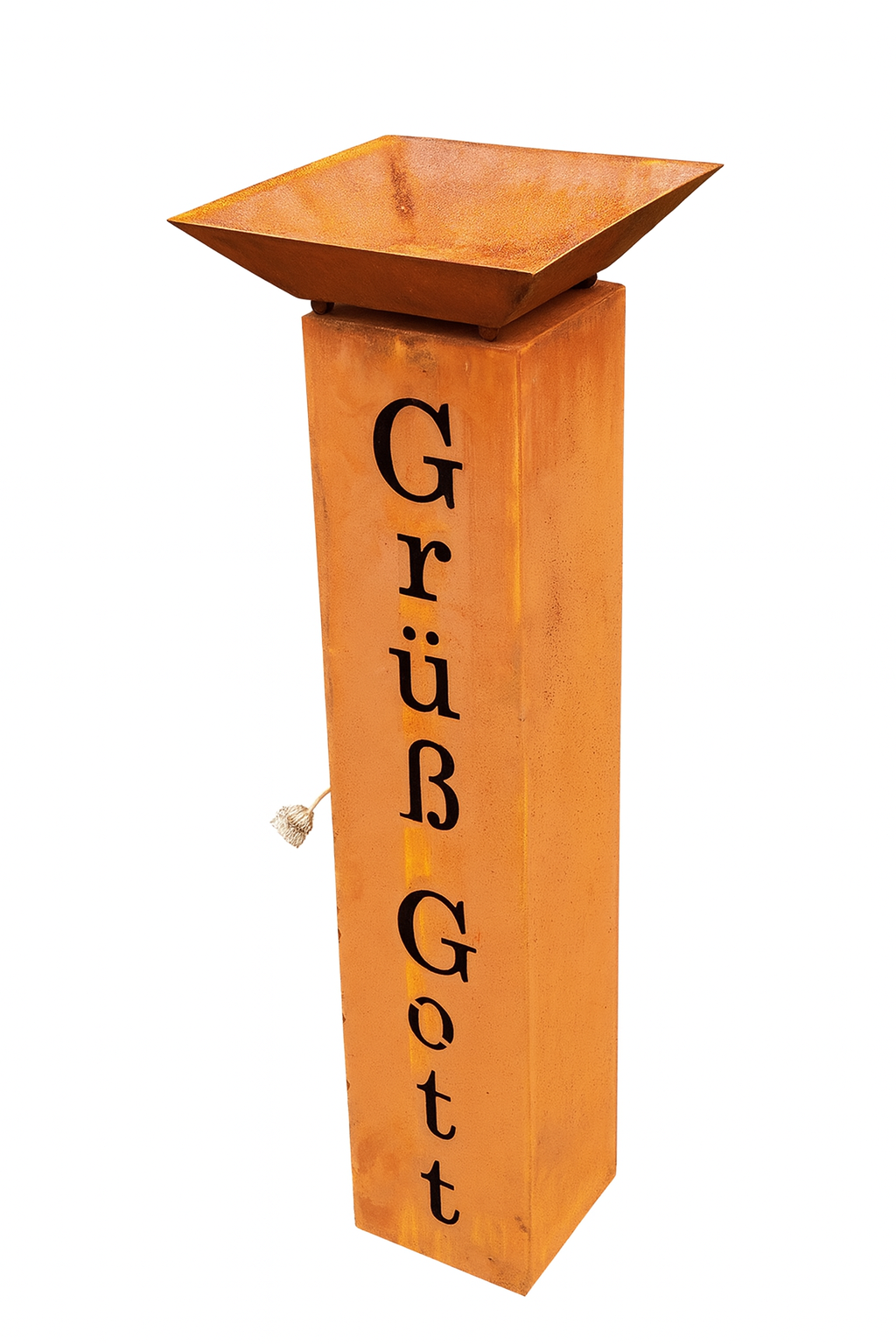 - Design: Rostsäule mit Schriftzug Grüß Gott