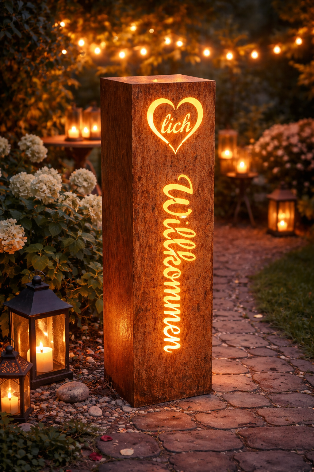 Setze ein stilvolles Statement im Eingangsbereich deines Zuhauses: Diese hochwertige Dekosäule Typ1 begrüßt deine Gäste mit einem eleganten „Willkommen“-Schriftzug und Herzmotiv. Ob als dekoratives Highlight oder als persönlicher Willkommensgruß – diese Stele sorgt für eine einladende Atmosphäre. Die 100 cm hohe Metallsäule aus Edelrost sorgt das ganze Jahr über für eine warme, einladende Atmosphäre im Eingangsbereich, auf der Terrasse oder im Garten. Ob vor der Haustür, im Garten, auf der Terrasse oder im Eingangsbereich: Diese Rostdeko schafft eine warme, einladende Atmosphäre und harmoniert perfekt mit jeder Jahreszeit. |