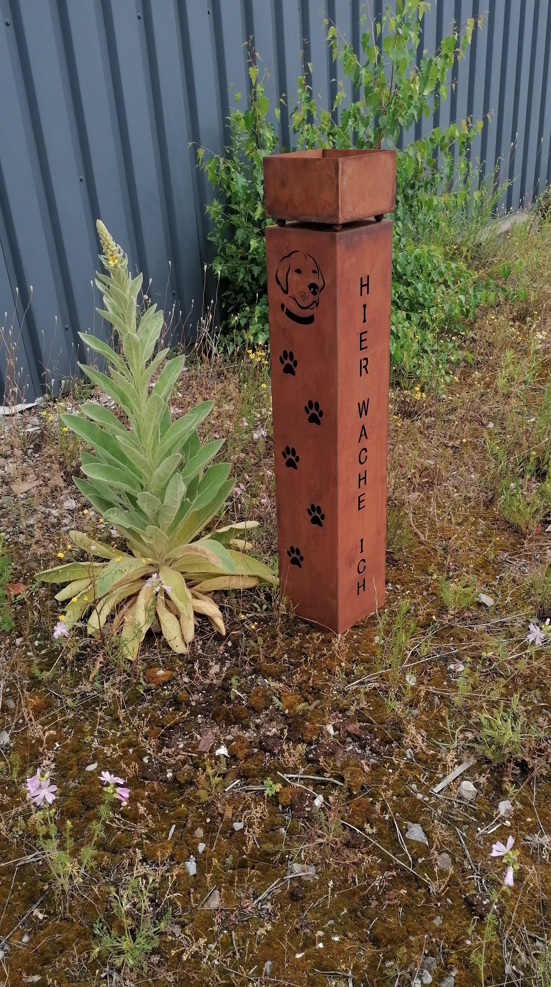 Gartensäule – „Hier wache ich“ mit Pfoten & Hundekopf – dekorative Rostsäule aus Metall |