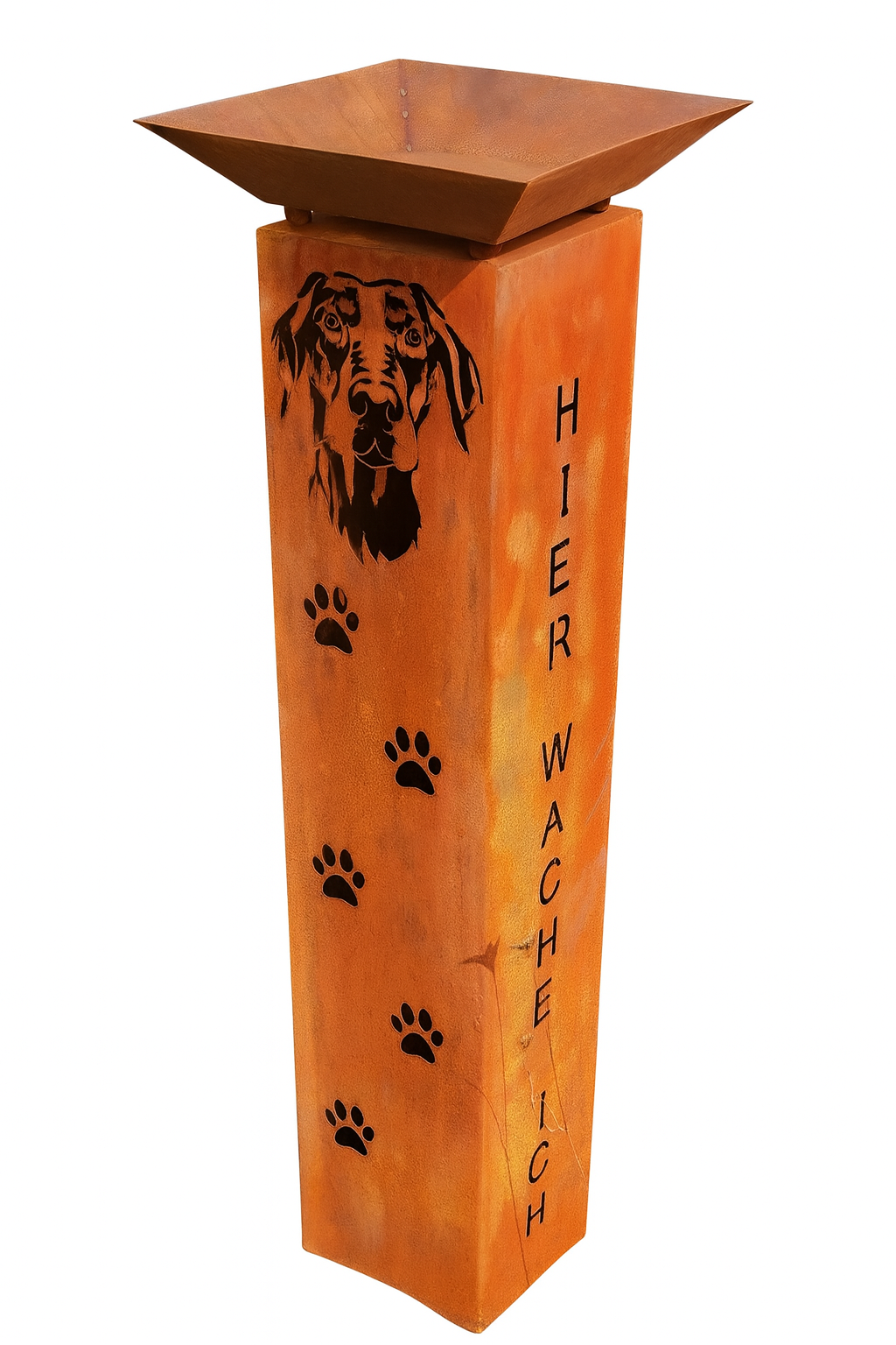 Gartensäule „Hier wache ich“ mit Hundekopf Dobermann – Edelrost |