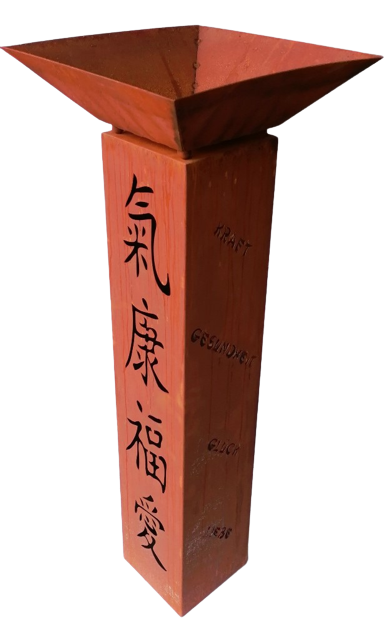 - Design: Edelrost-Säule mit Schriftzügen Liebe, Kraft, Glück, Gesundheit und chinesischen Zeichen