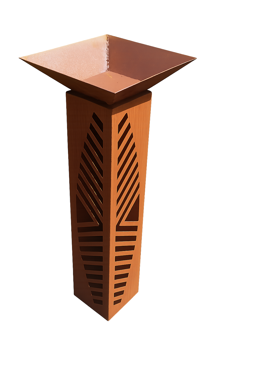 Diese außergewöhnliche Edelrost-Gartensäule überzeugt durch ihr einzigartiges Design aus Schlitzen, Streifen und dreieckigen Formen.