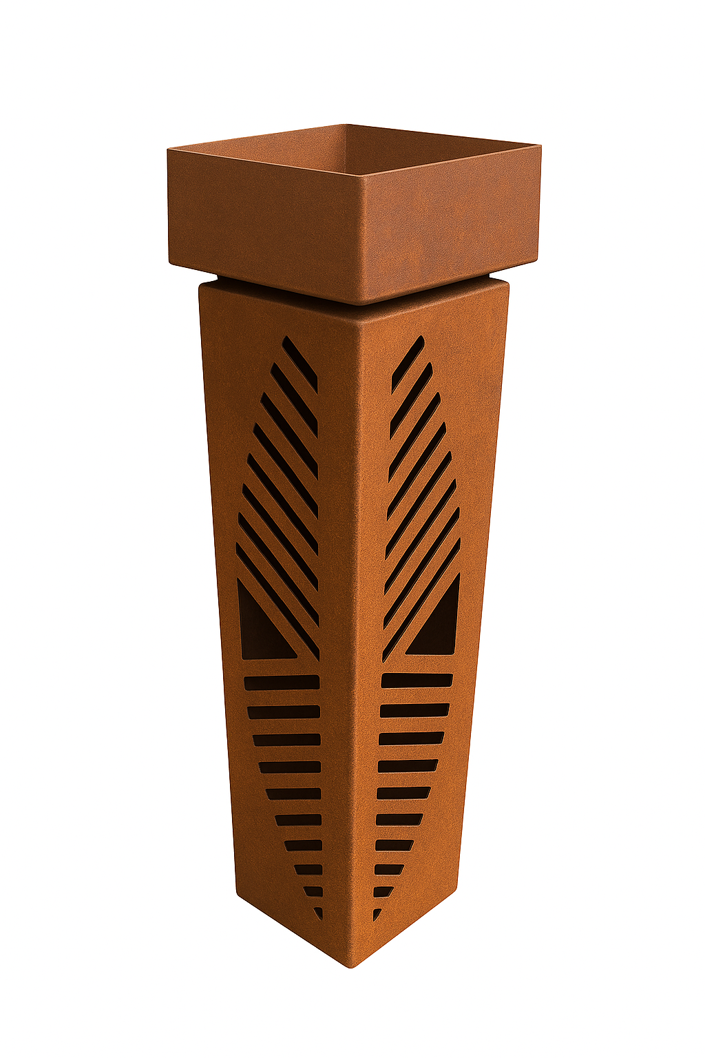Diese außergewöhnliche Edelrost-Gartensäule überzeugt durch ihr einzigartiges Design aus Schlitzen, Streifen und dreieckigen Formen.
