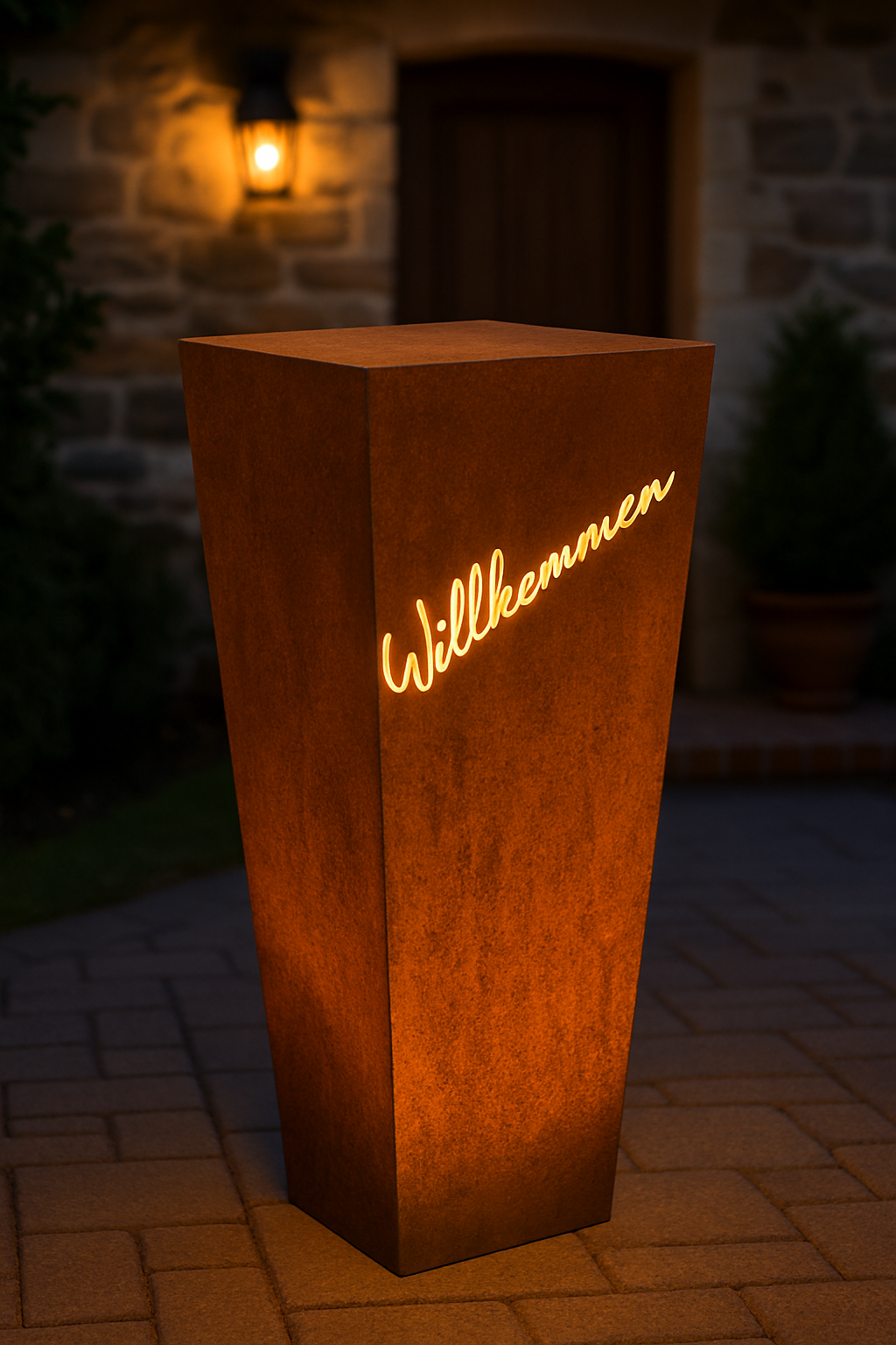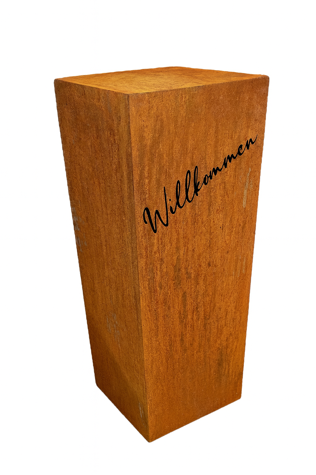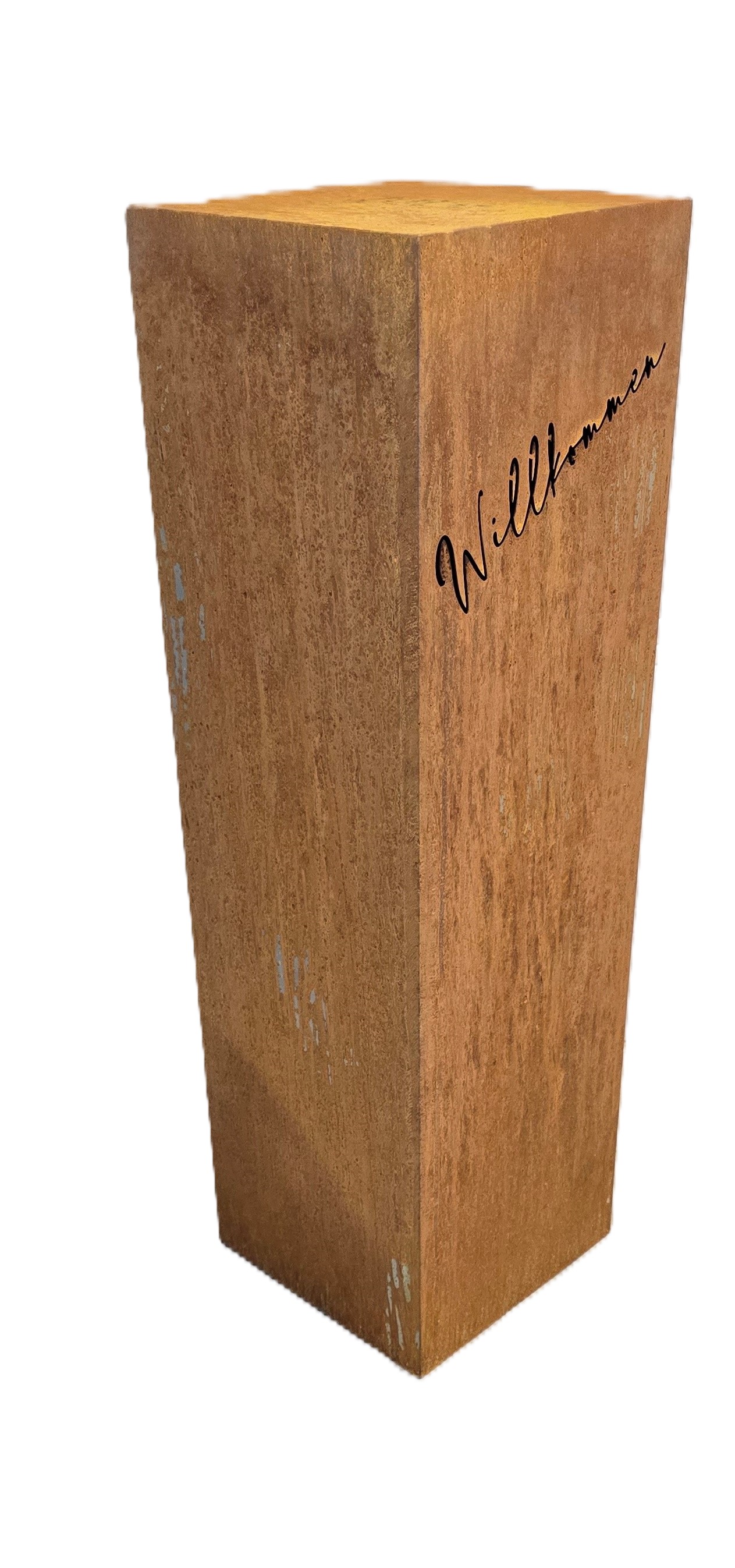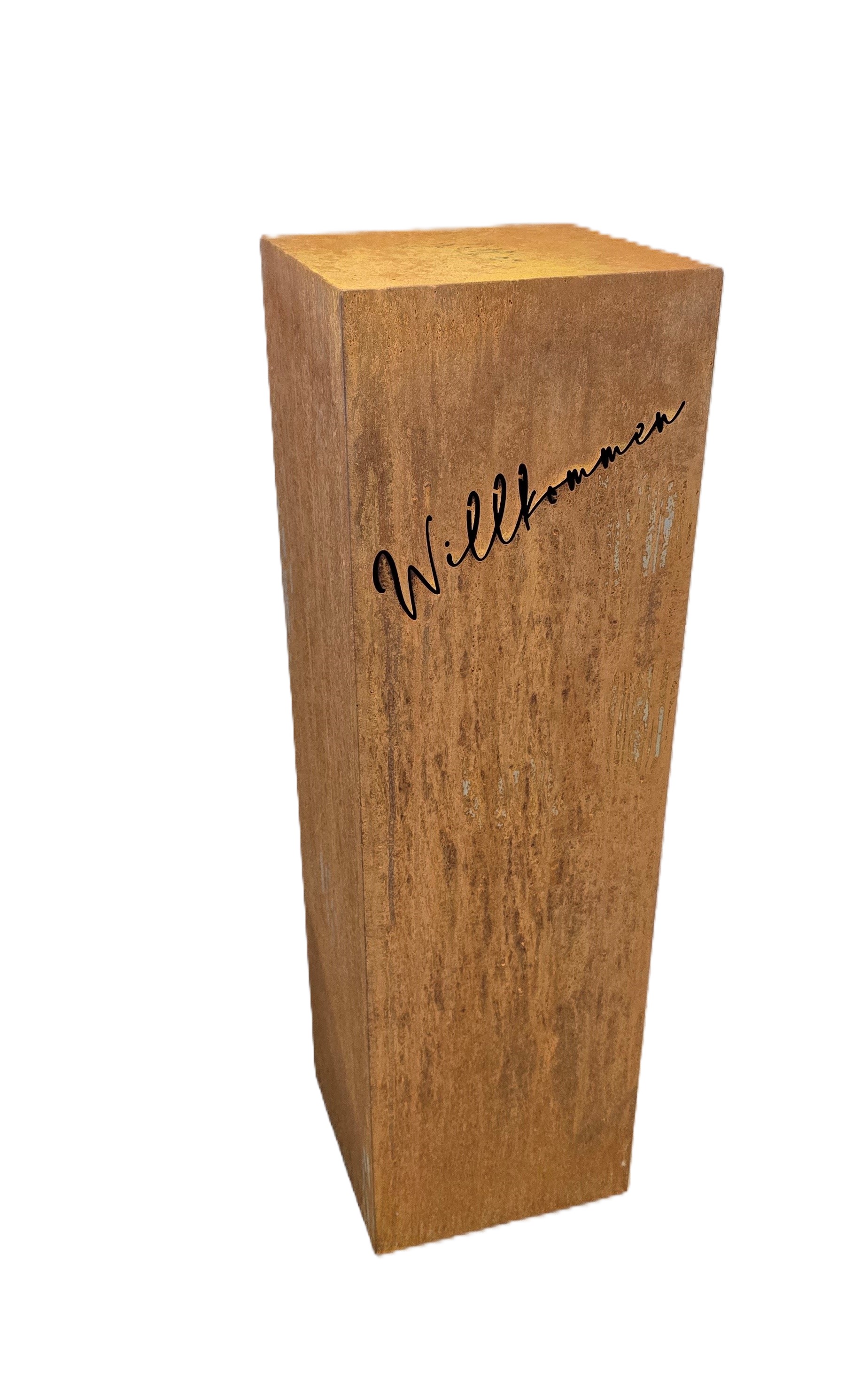 Gartensäule „Willkommen“ – Willkommen daheim – stilvoll mit Edelrost. |