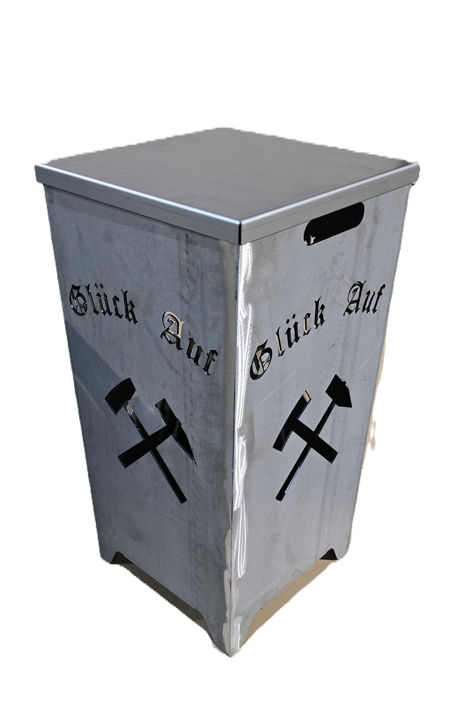 Der Feuerkorb „Glück Auf“ ist mehr als nur eine Feuerstelle – er ist ein Stück Tradition und Handwerkskunst. Gefertigt aus robustem, hitzebeständigem Stahl, vereint er hochwertige Verarbeitung mit einem unverwechselbaren Design, das dem Bergbau gewidmet ist. Die Seitenwände zieren präzise gelaserte Schriftzüge „Glück Auf“ sowie das klassische Schlägel-und-Eisen-Symbol, das im Schein des Feuers eindrucksvoll zu leuchten beginnt. Durch die ausgeschnittenen Motive entsteht bei Dunkelheit ein faszinierendes Lichtspiel, das an die Glut alter Bergwerksfeuer erinnert. Dank der eingearbeiteten Griffmulden lässt sich der Feuerkorb leicht transportieren und sicher positionieren. Die stabile Konstruktion garantiert Langlebigkeit – ideal für Garten, Terrasse oder Vereinsfeste mit bergmännischem Bezug. |