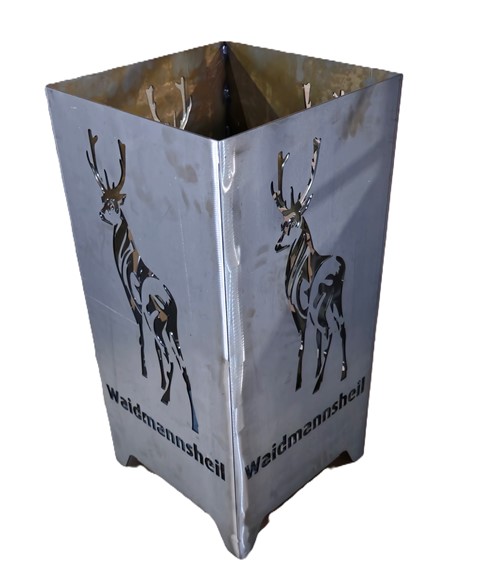 Das kunstvoll ausgeschnittene Hirschmotiv und der traditionelle Schriftzug „Waidmannsheil“ zieren alle vier Seiten und sorgen – im Schein der Flammen – für ein einzigartiges Lichtspiel.