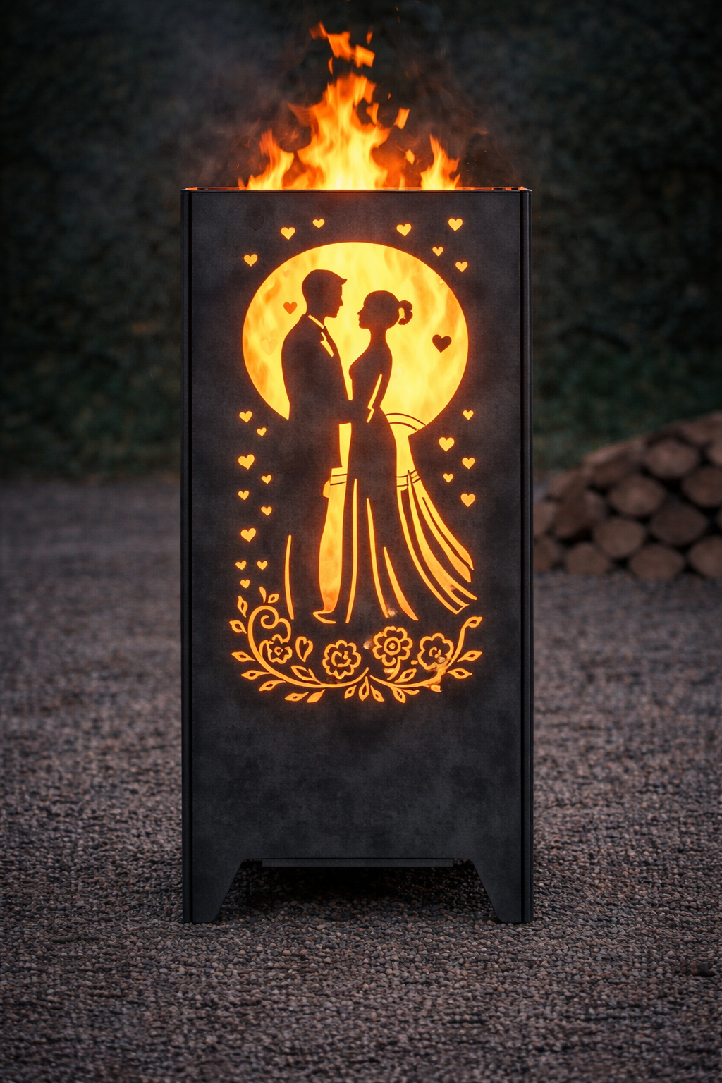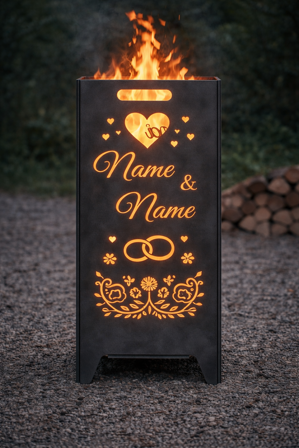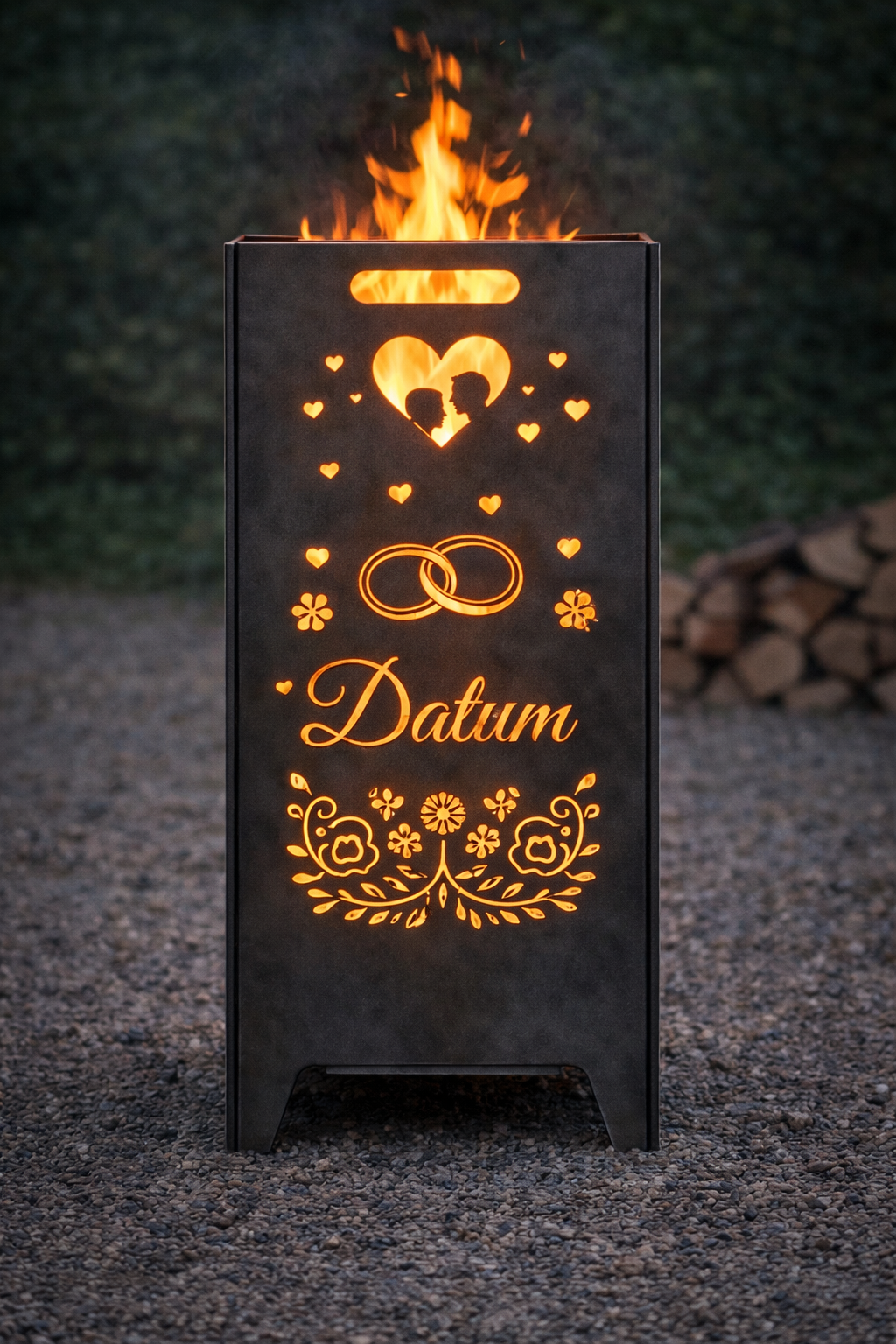 Romantisches Hochzeitsgeschenk & Erinnerung fürs Leben. Dieser hochwertige, personalisierte Feuerkorb mit Griffmulden ist weit mehr als eine Feuerstelle – er ist ein Symbol der Liebe und Verbundenheit. Mit liebevollen Motiven, den Namen des Brautpaares und dem Hochzeitsdatum wird jeder Feuerkorb zu einem einzigartigen Unikat, das Hochzeit, Garten und Terrasse in eine ganz besondere Atmosphäre taucht. Sobald das Feuer brennt, leuchten die ausgeschnittenen Motive und Schriftzüge stimmungsvoll im Flammenspiel. So entsteht ein unvergesslicher Moment, der das Brautpaar noch viele Jahre an seinen großen Tag erinnert. |