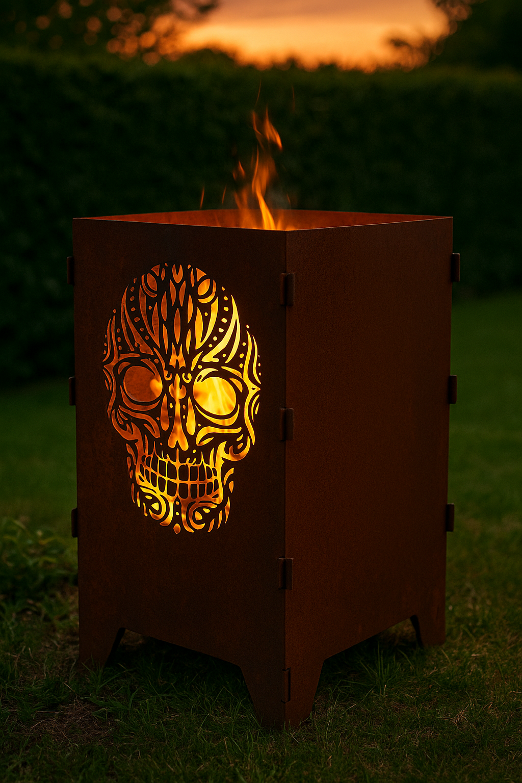 Dieser steckbare Feuerkorb mit modernem Totenkopf-Motiv ist ein absoluter Blickfang und setzt im Garten, auf der Terrasse oder beim Grillabend ein kraftvolles Statement. Gefertigt aus robustem 3 mm Stahl, überzeugt der Feuerkorb durch Stabilität, Langlebigkeit und saubere Verarbeitung. Die unbehandelte Oberfläche entwickelt im Laufe der Zeit eine einzigartige Edelrost-Patina, die dem Feuerkorb seinen modernen, urbanen Charakter verleiht. Perfekt für alle, die außergewöhnliches Design lieben und ihren Außenbereich mit ausdrucksstarker Metallkunst aufwerten möchten.