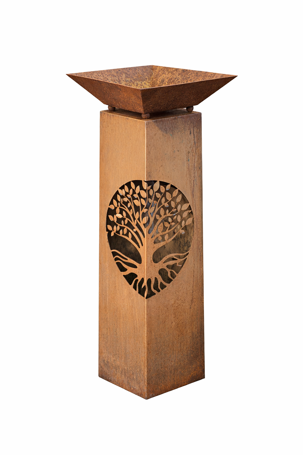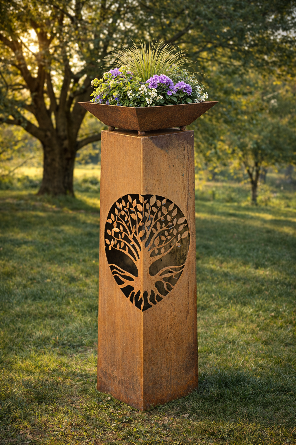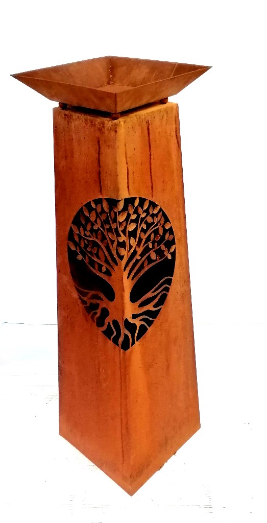Design: Konische Rostsäule mit ausgelasertem Lebensbaum-Motiv