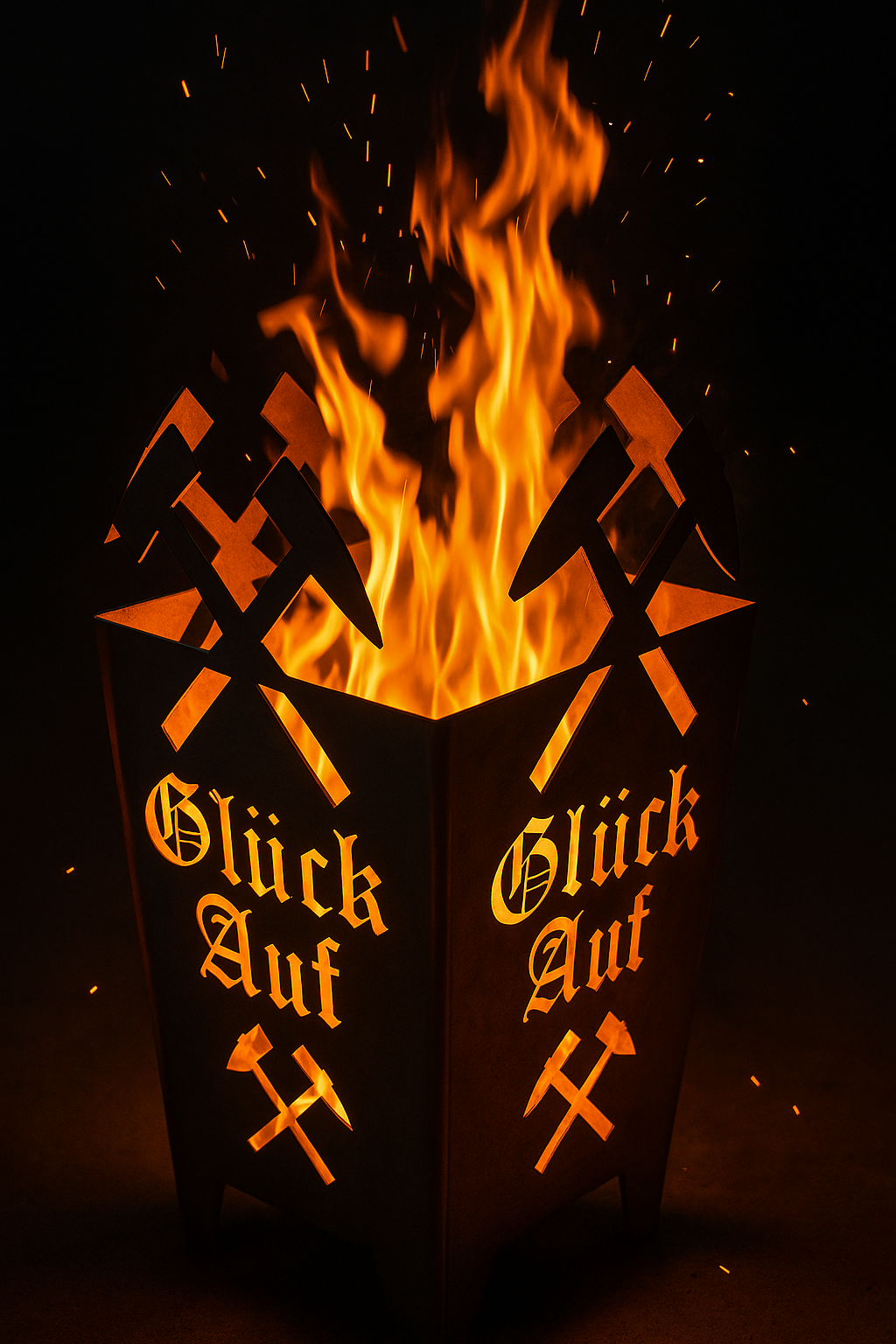 Feuerkorb „Glück Auf“ Hammer und Schlägel“ – Tradition trifft Funktionalität Beschreibung Der steckbare Feuerkorb „Glück Auf – Hammer und Schlägel“ vereint praktische Handhabung mit bergmännischer Symbolik und hochwertigem Design. Hergestellt aus robustem, lasergeschnittenem Stahl, besticht er durch seine einfache Montage, kompakte Lagerung und beeindruckende Optik. Das markante Bergbau-Motiv mit Hammer und Schlägel sowie der Schriftzug „Glück Auf“ machen diesen Feuerkorb zu einem echten Blickfang. Im Feuerschein leuchten die Symbole warm auf und erzeugen ein faszinierendes Lichtspiel – perfekt für gesellige Abende im Garten oder auf der Terrasse. Dank des steckbaren Systems lässt sich der Feuerkorb schnell aufbauen und ebenso leicht wieder zerlegen – ideal für den Transport, die Aufbewahrung oder den mobilen Einsatz auf Vereinsfesten, Campingplätzen oder bei Events. Produktdaten Höhe: 75 cm Breite / Tiefe: ca. 37 × 37 cm Materialstärke: Feuerkorb & Rost: 3 mm Stahl Aschewanne: 2 mm Stahl Bauart: gesteckt Motiv: Glück Auf und Hammer & Schlägel Hinweis: Weitere technische Details siehe Unterpunkte. Highlights Extrem robust: 3 mm starkes Stahlblech Design: Glück Auf und Hammer & Schlägel Einfaches Stecksystem – alle Seiten sind miteinander verbundenSchneller Aufbau ohne Werkzeug Platzsparende Lagerung durch Stecksystem Inklusive: Ascherost & Aschewanne Vielseitig: auch als Hocker oder Pflanzständer nutzbar Material & Pflege Aus unbehandeltem Stahl – entwickelt mit der Zeit eine natürliche Rostpatina Patina verleiht einen einzigartigen, authentischen Look Reinigung durch einfaches Entnehmen von Rost und Aschewanne Tipp vom Hersteller Die Aschewanne kann auch als Deckel genutzt werden – ideal als Abstellfläche für Pflanzschalen oder als Sitzfläche. So wird dein Feuerkorb zum echten Multitalent im Garten. Zubehör Grillplatte – perfekt für stimmungsvolle BBQ-Abende Weitere Zubehörteile findest du direkt in unserem Shop. Sicherheitshinweise Nur auf nicht brennbarem Untergrund betreiben Ausreichend Abstand zu brennbaren Materialien halten Es kann zu Funkenflug kommen Kinder nie unbeaufsichtigt in der Nähe lassen Heiße Asche nicht in Mülleimer oder ungeeignete Behälter füllen Lieferumfang 1 × Feuerkorb 1 × Ascherost 1 × Aschewanne Lieferhinweis Feuerkorb wird ungerostet geliefert Kratzer oder Schleifspuren aus der Herstellung sind normal Erste Rostansätze können vorhanden sein und sind kein Mangel