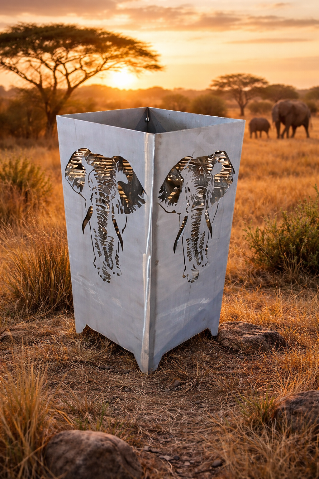 Der Feuerkorb mit Elefanten-Motiv vereint die Kraft der Natur mit stilvoller Handwerkskunst. Gefertigt aus massivem, lasergeschnittenem Stahl, zeigt dieser außergewöhnliche Feuerkorb auf allen Seiten elegante Elefanten-Silhouetten, die im Feuerschein lebendig werden. Durch die präzisen Ausschnitte entsteht bei Dunkelheit ein faszinierendes Lichtspiel – warme Flammen tanzen hinter den majestätischen Umrissen der Elefanten und schaffen eine Atmosphäre voller Ruhe, Stärke und Exotik. Ob im Garten, auf der Terrasse oder bei besonderen Outdoor-Events – dieser Feuerkorb zieht alle Blicke auf sich. Er ist hitzebeständig, langlebig und wetterfest, und verbindet dekorative Eleganz mit praktischer Funktion. Erwecke die Stärke der Natur – mit dem majestätischen Elefanten-Feuerkorb! |