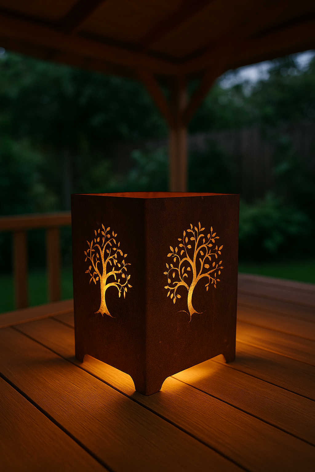 Gartensäule „Lebensbaum konisch“ – wo Licht auf Bedeutung trifft Beschreibung Diese elegant konisch geformte Edelrost-Säule mit ausgelasertem Lebensbaum-Motiv ist ein echtes Kunstwerk für den Garten. Der Baum des Lebens steht seit Jahrhunderten als Symbol für Stärke, Wachstum und die Verbindung zwischen Himmel und Erde – und macht diese Säule zu einem besonderen Highlight für jeden Außenbereich. Die leicht nach oben zulaufende (konische) Form sorgt für eine harmonische Silhouette und verleiht der Säule einen modernen, eleganten Charakter. Gefertigt aus hochwertigem Metall und veredelt mit einer Edelrost-Patina, fügt sich die Säule wunderbar in natürliche wie moderne Gartenstile ein. Ob einzeln platziert, mit einer passenden Edelrost-Schale kombiniert oder mit Licht dekoriert – diese Lebensbaum-Säule verleiht Garten, Terrasse oder Eingangsbereich eine warme, symbolische Ausstrahlung. Produktdaten Material: robustes Stahlblech (gerostet) Säule (Maße): Höhe 100 cm; unten: 30 x 30 cm, oben: 20 x 20 cm Gewicht Säule: ca. 8,5 kg Schale klein: unten 20 × 20 cm, oben 30 × 30 cm, Höhe 8 cm Schale groß: unten 20 × 20 cm, oben 40 × 40 cm, Höhe 13 cm Schale Kubus: 20 × 20 cm, Höhe 10 cm Hinweis: Auswahl der Schalen erfolgt – sofern verfügbar – über die Varianten im Produkt. Verarbeitung & Kombination Stabile, verschweißte Ausführung Offene Unterseite zur unkomplizierten Unterleuchtung Perfekt kombinierbar mit Edelrost-Schalen, Deko-Elementen und Bepflanzung Highlights Ideal als Dekoration für Garten, Terrasse oder EingangsbereichVerschweißt für hohe Stabilität Form: Konisch zulaufend – stabil, elegant & standfest Design: Konische Rostsäule mit ausgelasertem Lebensbaum-Motiv Material: langlebiges Metall mit schöner Edelrost-PatinaOffene Unterseite – ideal zur Beleuchtung mit Lampe oder LED Kombinierbar mit verschiedenen Edelrost-Schalen Jede Säule ein Unikat durch den natürlichen Rostprozess Wissenswertes Fertigung aus hochwertigem Stahlblech mit edler Rostpatina – ein natürlicher Prozess, der jedes Stück einzigartig macht Made in Germany – eigene Herstellung; auf Wunsch individuelle Anfertigungen möglich (gerne Angebot anfragen) Farbveränderung im Außenbereich ist natürlich: von rötlich-orange bis warmes Braun Rost kann abfärben – bitte empfindliche Untergründe (innen & außen) schützen Trotz sorgfältiger Verarbeitung können bei Metallteilen scharfe Kanten vorhanden sein Lieferumfang 1 × Gartensäule Schalen optional je nach gewählter Variante