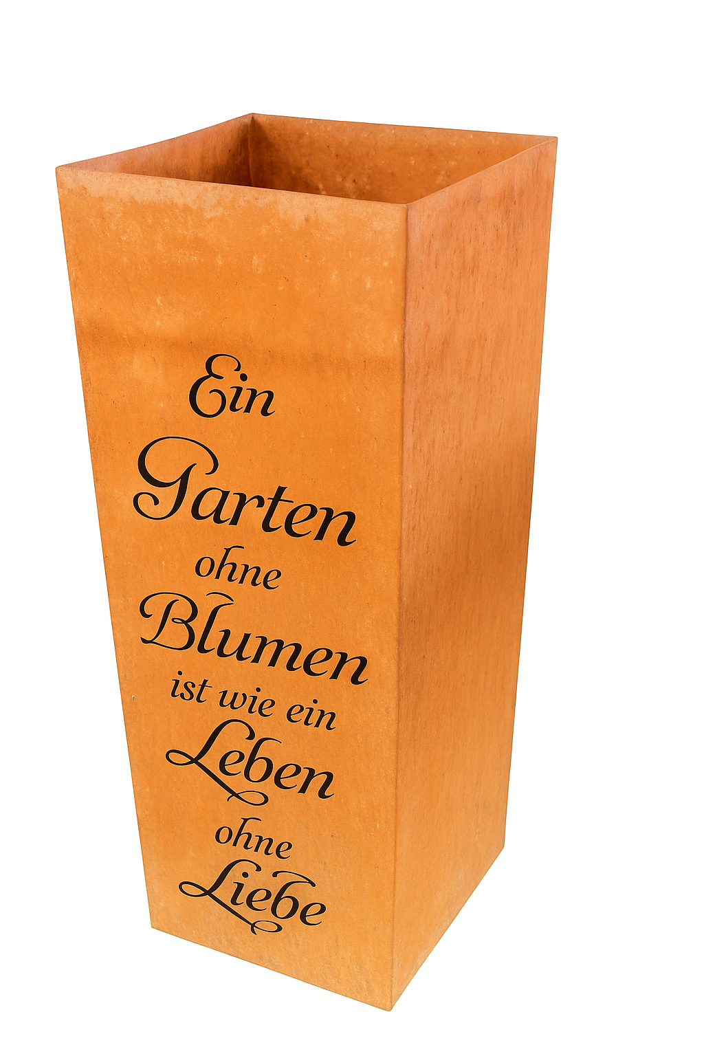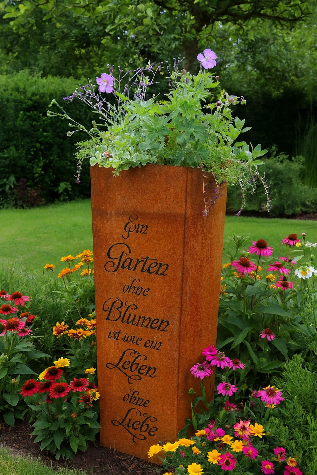 Design: Rostsäule mit Schriftzug „Ein Garten ohne Blumen ist wie ein Leben ohne Liebe“