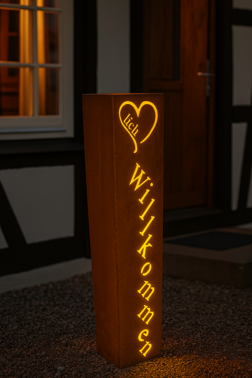 - Design: Rostsäule mit Schriftzug Herzlich Willkommen