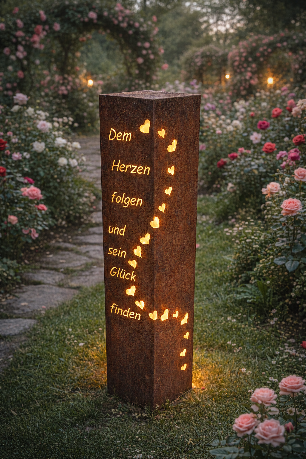 Diese liebevoll gestaltete Rostsäule mit dem Schriftzug „Dem Herzen folgen und sein Glück finden“ verleiht deinem Garten, deiner Terrasse oder dem Eingangsbereich eine besondere Atmosphäre.