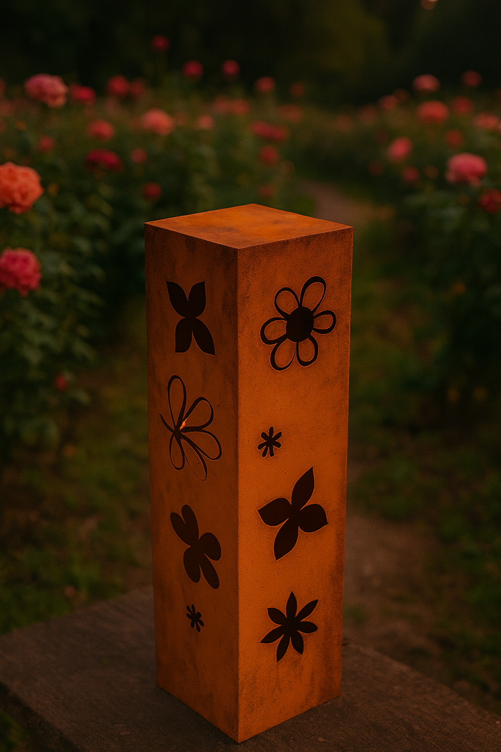 Diese außergewöhnliche Rostsäule mit 3D-Blumen vereint handwerkliche Präzision mit natürlicher Schönheit.