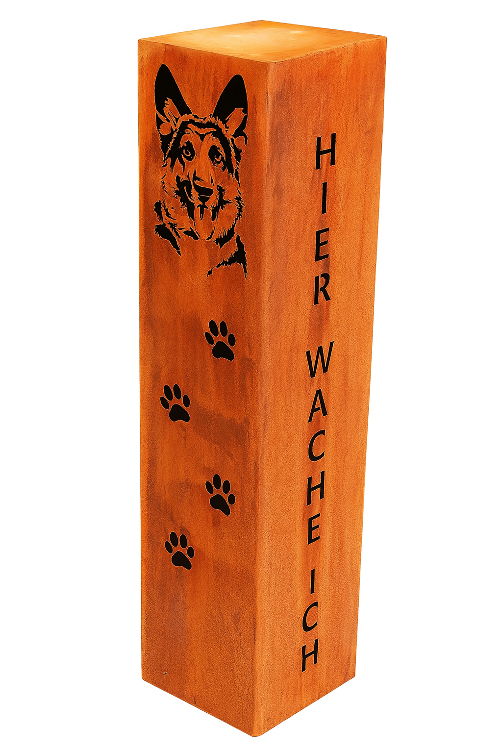 Gartensäule – „Hier wache ich“ mit Hundekopf Schäferhund – Edelrost |