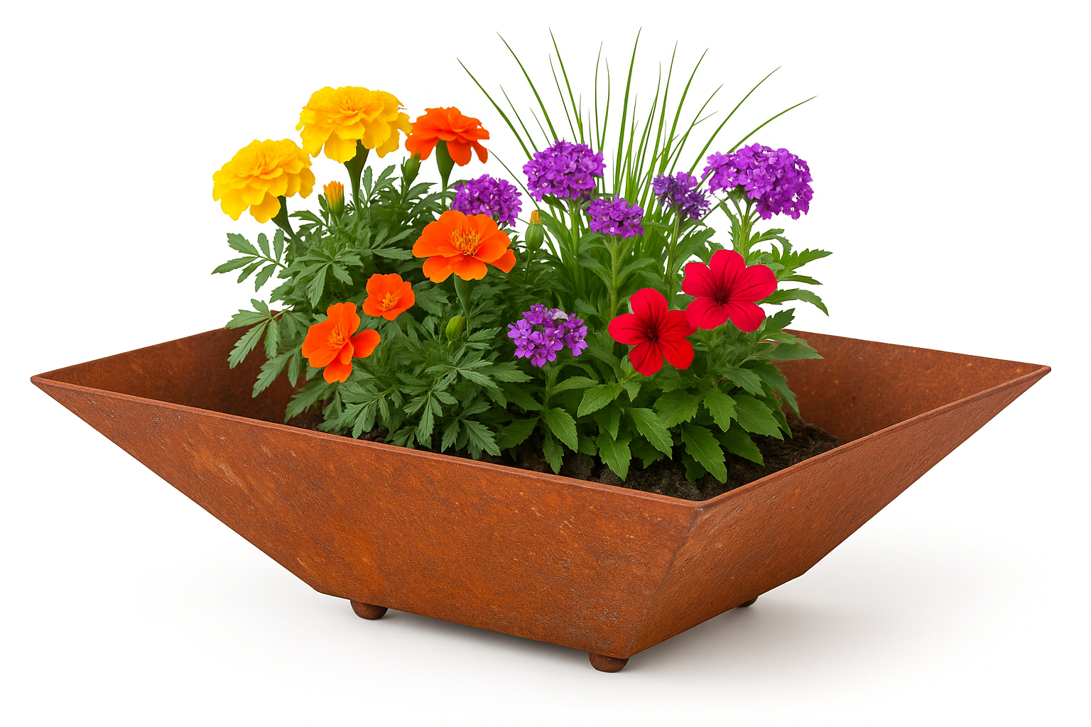 Dekorieren, bepflanzen, genießen – die Edelrost Pflanzschale 38×38 cm bringt Charakter in Garten & Zuhause.